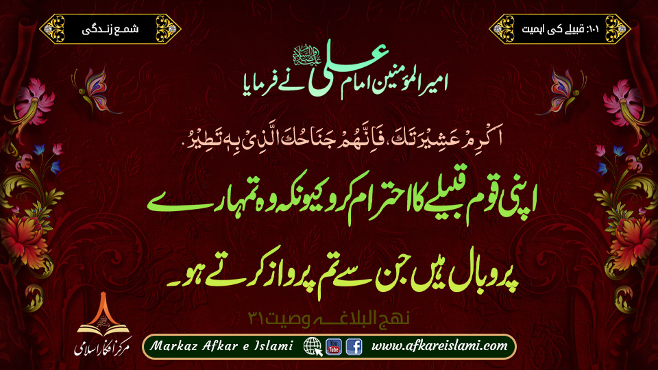 اَكْرِمْ عَشِيْرَتَكَ فَاِنَّهُمْ جَنَاحُكَ الَّذِيْ بِهٖ تَطِيْرُ۔ (نہج البلاغہ وصیت ۳۱)