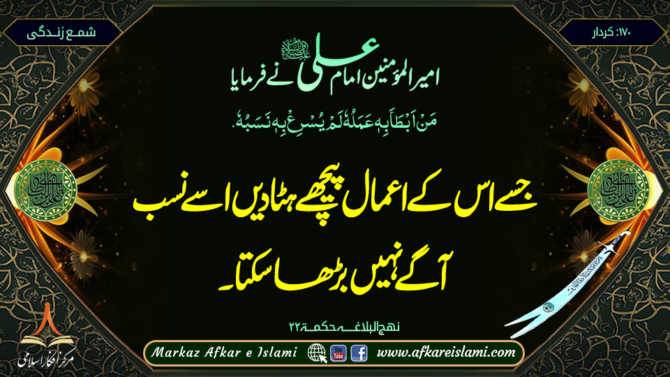 مَنْ اَبْطَاَ بِهٖ عَمَلُهٗ لَمْ يُسْرِعْ بِهٖ نَسَبُهٗ۔ (نہج البلاغہ حکمت 22)