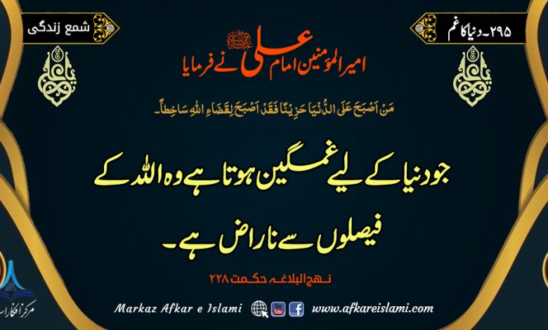 مَنْ اَصْبَحَ عَلَى الدُّنْیَا حَزِیْنًا فَقَدْ اَصْبَحَ لِقَضَاءِ اللهِ سَاخِطاً۔ (نہج البلاغہ حکمت ۲۲۸)